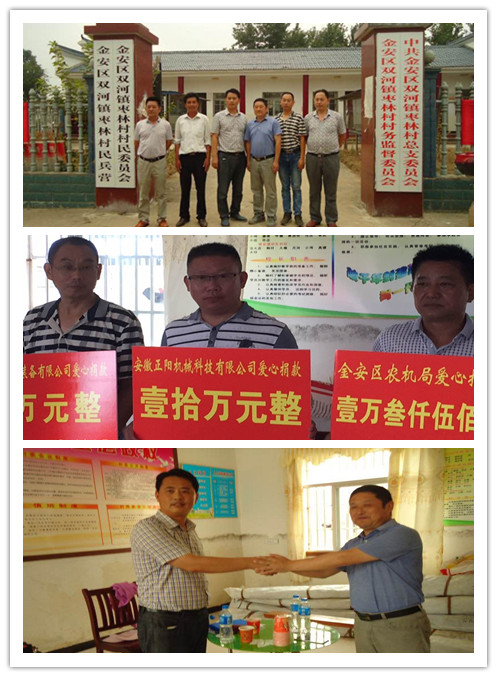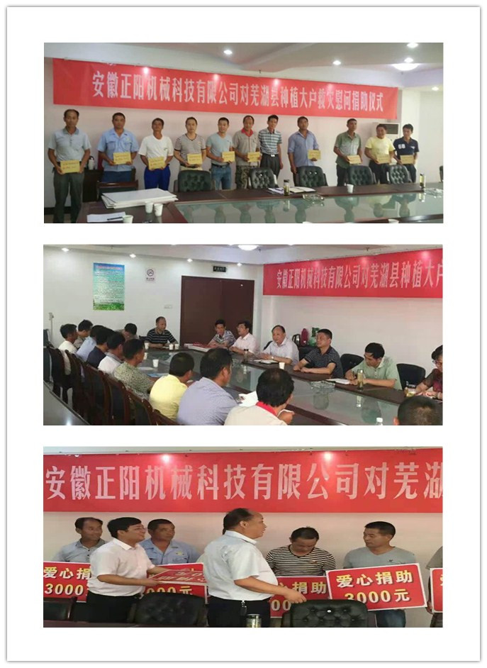 同時我公司針對今年長江中下游、江淮區(qū)域發(fā)生的嚴重的洪澇災(zāi)害勇于擔當,注重快速發(fā)展自身的同時更高度重視企業(yè)社會責任,本著以回報社會為己任;企業(yè)利潤來之于民、用之于民;義利兼顧的宗旨,安徽正陽機械科技有限公司總經(jīng)理張為法于2016年7月13日下午前往“正陽”糧食烘干機主銷區(qū)域安徽蕪湖、六安、湖北孝感等受災(zāi)嚴重地區(qū)捐贈現(xiàn)金數(shù)十萬元,幫助災(zāi)區(qū)人民萬眾一心共抗洪災(zāi),盡快恢復(fù)生產(chǎn),讓受災(zāi)群眾真實感受到黨和政府的溫暖、民營企業(yè)家的責任,公司以正能量品牌的形象和風范履行了自身應(yīng)盡的社會責任。